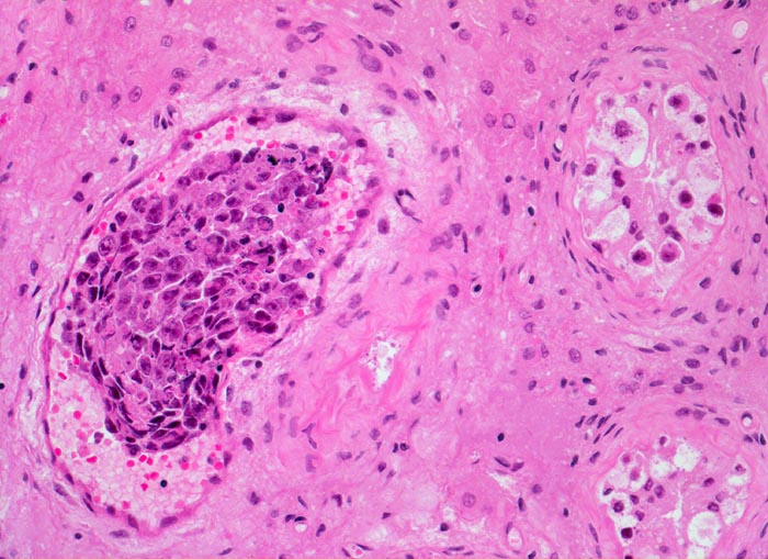 Histologisch bilden die Tumorzellen solide Zellplatten, Drüsen oder papilläre Strukturen mit Einblutungen und Nekrosen. Die Tumorzellen sind polygonal, kubisch oder zylindrisch, haben reichlich Zytoplasma und unscharfe Zellgrenzen. Die grossen Kerne haben grob verklumptes Chromatin und enthalten oft mehrere sehr grosse unregelmässige Nukleolen. Gefässeinbrüche und eine testikuläre intratubuläre Neoplasie sind in der Tumorumgebung häufig nachweisbar