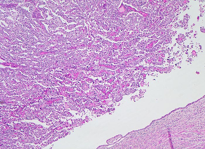 Anstelle des Endometriums findet sich in der linken Hälfte des Uteruskavums ein Adenokarzinom bestehend aus architektonisch komplexen Drüsen. Die Drüsen liegen teils dos à dos ohne erkennbares Stroma zwischen zwei Drüsenschläuchen.