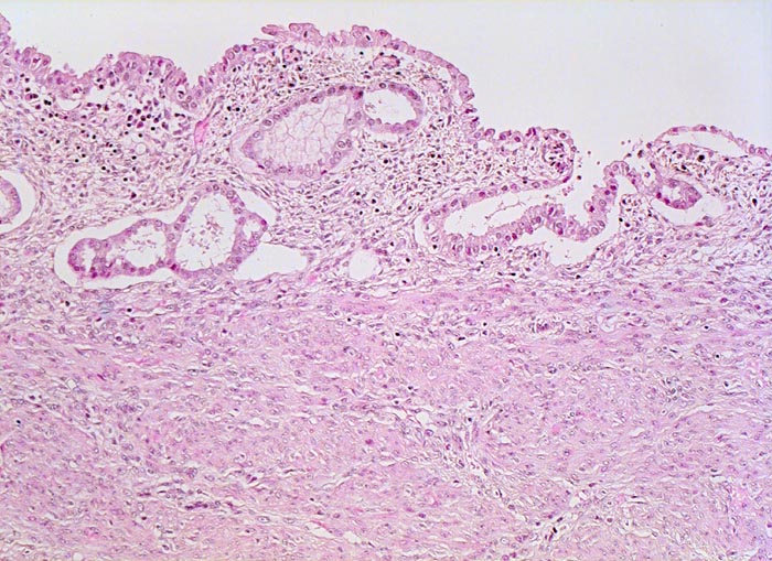 Anmerkung: Typischerweise ist das endometrioide Karzinom des Uterus als Folge des ursächlichen Hyperöstrogenismus assoziiert mit einem hyperplastischen Endometrium (siehe Präparat 148). Im Kurspräparat erscheint hingegen das nicht-neoplastische Endometrium nach vorausgegangener Kurettage atroph. Atrophes Endometrium findet sich sonst charakteristischerweise neben serösen Endometriumkarzinomen postmenopausaler Patientinnen. Das sollte der Kliniker dem Pathologen mitteilen: