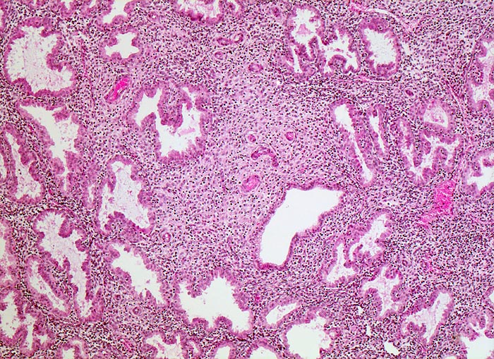 Histogenese: Karzinome im Bereich des Corpus uteri sind bis auf wenige Ausnahmen Adenokarzinome ausgehend von den Endometriumdrüsen. Der Begriff Endometriumkarzinom umfasst mehrere Entitäten, von denen das häufigste (80%) das endometrioide Adenokarzinom ist (Histokurspräparat), welches in den meisten Fällen östrogenabhängig ist. Die Präkanzerose der endometrioiden Endometriumkarzinome ist die atypische Hyperplasie. Nach der WHO-Klassifikation wird unterschieden zwischen einer Hyperplasie ohne Atypie mit einem Progressionsrisiko zum Karzinom von 1-3% und einer atypischen Hyperplasie bzw. einer endometrioiden intraepithelialen Neoplasie (EIN) mit einem Progressionsrisiko zum Karzinom von 25-30% innerhalb eines Jahres nach Kürettage (Langzeitrisiko bis zu 45x erhöht!). Endometrioide Adenokarzinome können auch von der Zervix, vom Ovar oder von der Tube ausgehen. Wenn ein endometrioides Karzinom gleichzeitig im Uterus und im Ovar vorliegt, kann deshalb nicht immer mit Sicherheit gesagt werden, ob es sich um zwei unabhängige Primärtumoren oder um ein metastasierendes Karzinom handelt.