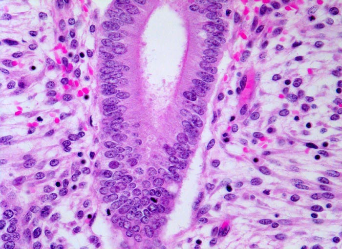 Tumordrüsen ausgekleidet von mehrreihig angeordneten Tumorzellen mit hyperchromatischen polymorphen längsovalen Tumorzellkernen mit zahlreichen Mitosen. Die Morphologie der Tumordrüsen erinnert an proliferatives Endometrium.