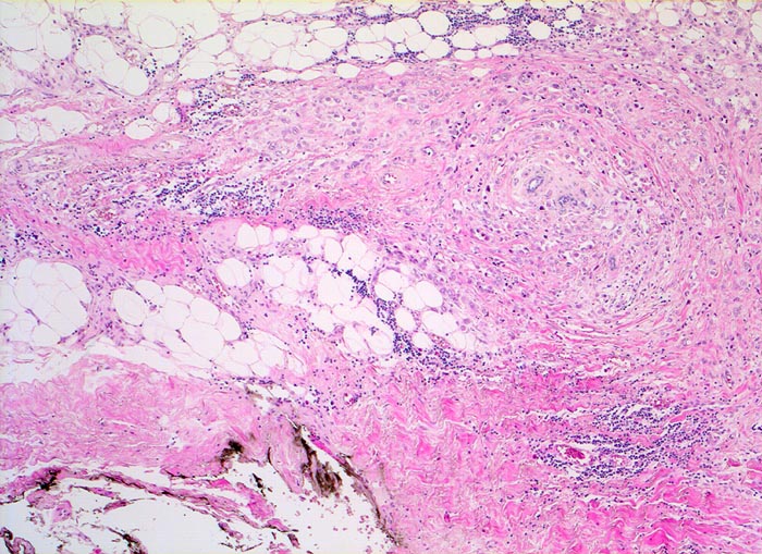 • Multifokale Infiltrate eines invasiv lobulären Mammakarzinoms: Kleine monomorphe, zytoplasmaarme Tumorzellen bilden einreihige Ketten (gänsemarschartig = Indian files) oder sind konzentrisch um nicht neoplastische Drüsen angeordnet.