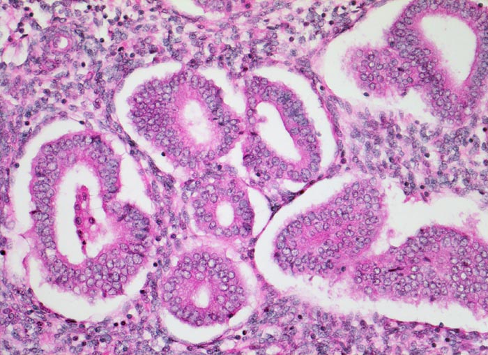 • Einige Drüsen werden von metaplastischem tubarem Epithel oder Flimmerepithel ausgekleidet. Das sollte der Kliniker dem Pathologen mitteilen: