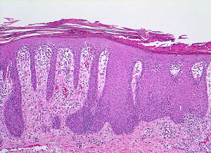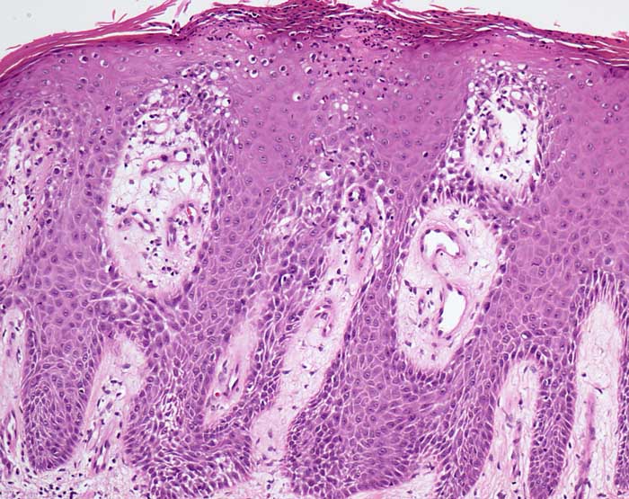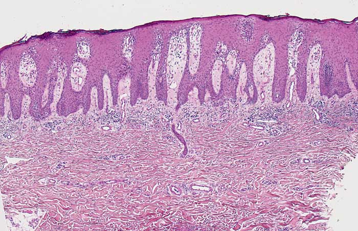 Die klassischen histologischen Befunde finden sich am deutlichsten in frühen schuppenden Papeln sowie nahe am Rand wachsender erythematosquamöser Plaques. Die behandelte Psoriasis ist histologisch hingegen schwer von anderen Dermatosen abgrenzbar.