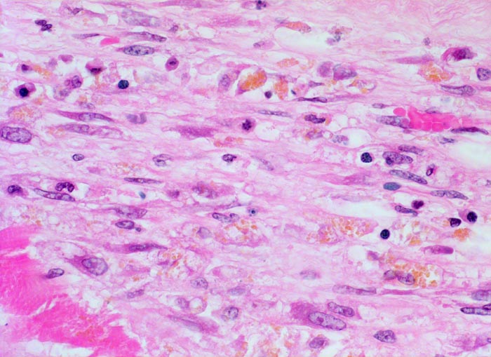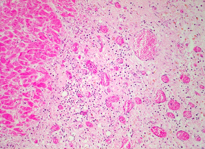 Vier Tage nach Infarktereignis beginnt vom Rand her die Einwanderung von Granulationsgewebe in das Infarktgebiet. Das Granulationsgewebe besteht aus Makrophagen, Lymphozyten, Plasmazellen, Kapillarsprossen und Fibroblasten. Der Granulationsgewebssaum vergrössert sich um rund 0.1mm pro Tag. Die Breite des Randsaums erlaubt deshalb eine Abschätzung des Infarktalters. In der zweiten Woche nach Infarkt lassen sich im Granulationsgewebe histologisch die ersten zarten Kollagenfasern nachweisen.