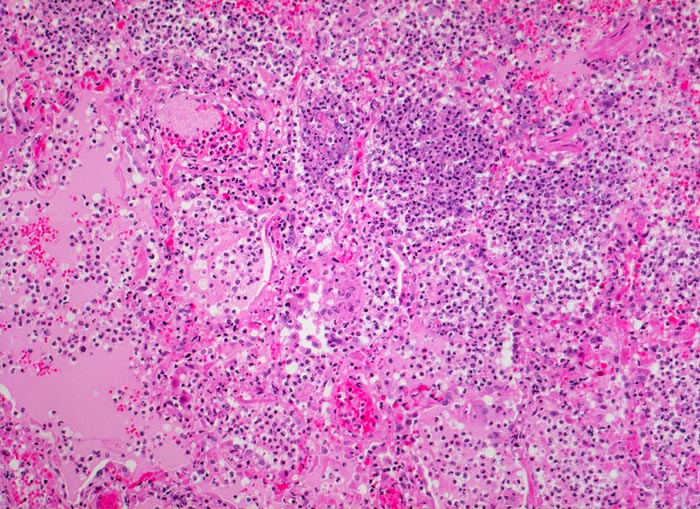 Alveolen gefüllt mit hell-eosinophiler Ödemflüssigkeit oder neutrophilen Granulozyten, Erythrozyten und wenig Fibrin.