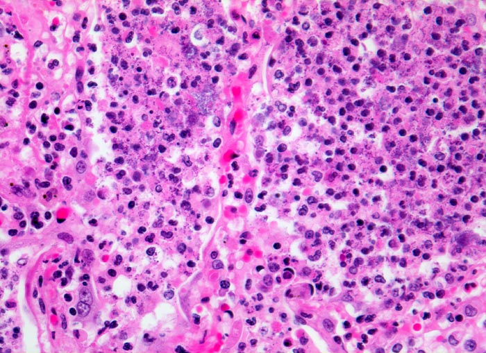 Haufen von blauen kokkoiden Bakterien in einigen Alveolen.