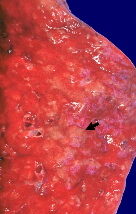 Morphologie: Eine Pneumonie kann einen ganzen Lappen befallen (Lobärpneumonie), Alveolen in der Umgebung eines Bronchus (Bronchopneumonie) oder das Interstitium (interstitielle Pneumonie) mit entsprechend unterschiedlichen makroskopischen Befunden. Bei einer schweren Bronchopneumonie sind meist mehrere Lappen befallen und es lassen sich bereits makroskopisch gelbliche, leicht erhabene, brüchige, unscharf begrenzte, gelegentlich zentral abszedierte Herde von einigen Millimetern bis wenigen Zentimetern Durchmesser nachweisen. Der Abstrichsaft ist trübe. Die befallenen Lappen sind vergrössert und aufgrund des entzündlichen Ödems schwerer. In einigen Fällen lässt sich eine fibrinöse Pleuritis ( 316) oder selten ein Pleuraempyem ( 775) nachweisen. Bei einer eitrigen Herdpneumonie ist die Mukosa der Bronchien und Bronchiolen ganz oder teilweise zerstört und mit einem fibrinös-eitrigen Exsudat belegt. Im Lungenparenchym selbst sind unterschiedlich grosse Infiltratherde bevorzugt um die Luftwege erkennbar. Benachbarte Alveolen sind gefüllt mit Granulozyten, Erythrozyten, Fibrin und eventuell Bakterien. Die Herde können konfluieren oder zentral einschmelzen (abszedierende Pneumonie) ( 195).