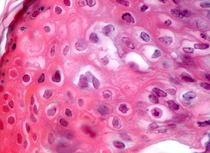 • Zytopathische Veränderungen der Keratinozyten im Randbereich des Bläschens bzw. des Hautulkus: Keratinozyten mit stahlgrauen milchglasartigen Kernen mit kondensiertem Chromatin in der Kernperipherie. Syncytiale mehrkernige Riesenzellen, deren Kerne sich gegenseitig eindellen (nuclear molding).