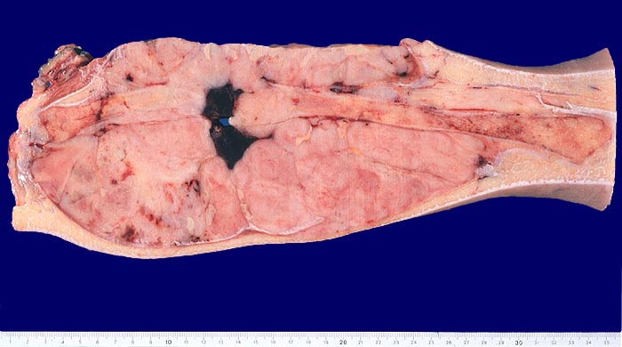 Das makroskopische Bild ist uncharakteristisch und variiert in Abhängigkeit von der Lokalisation. Fokale Nekrosen und zystische Degeneration sind häufig. Es werden verschiedene histologische Subtypen unterschieden, welche charakteristische molekulargenetische Aberrationen aufweisen und mit unterschiedlichen Prognosen assoziiert sind. Die beste Prognose haben botryoide und spindelzellige Rhabdomyosarkome gefolgt von embryonalen Rhabdomyosarkomen (intermediäre Prognose) und alveolären bzw. pleomorphen Rhabdomyosarkomen (schlechteste Prognose). Therapieantwort und Prognose hängen neben der Histologie auch von der Lokalisation ab. Embryonale Rhabdomyosarkome zeigen ein breites morphologisches Spektrum. Dieses reicht von wenig differenzierten Tumoren, die nur mittels Immunhistochemie und Elektronenmikroskopie diagnostizierbar sind zu gut differenzierten Tumoren, die fetaler Muskulatur ähneln. Oft findet sich eine Mischung von wenig differenzierten kleinen, runden und/oder spindeligen Zellen und eine variable Anzahl differenzierter Rhabdomyoblasten mit reichlich eosinophilem Zytoplasma. Die Rhabdomyoblasten können rund, spindelig, kaulquappenförmig oder spinnwebenförmig sein. Besser differenzierte Zellen enthalten reichlich Zytoplasma mit Querstreifung, welche allerdings teilweise nur elektronenmikroskopisch nachweisbar ist.