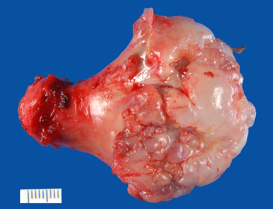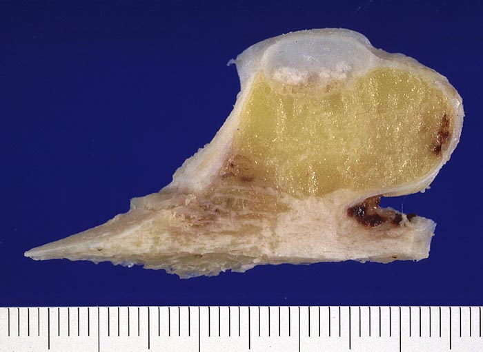 Morphologie: Osteochondrome sind breitbasig dem Knochen aufsitzende oder gestielte knöcherne Tumoren, die von einer 1-6mm dicken Kappe aus hyalinem Knorpel bedeckt werden. Zwischen Knorpel und Knochen liegt eine Zone enchondraler Ossifikation, die der normalen Wachstumsfuge ähnelt und den Ausgangspunkt für die Grössenzunahme des Tumors bei noch nicht abgeschlossenem Skelettwachstum darstellt. Der hyaline Knorpel wirkt etwas unorganisiert und ist bedeckt von einer dünnen Schicht Perichondrium.