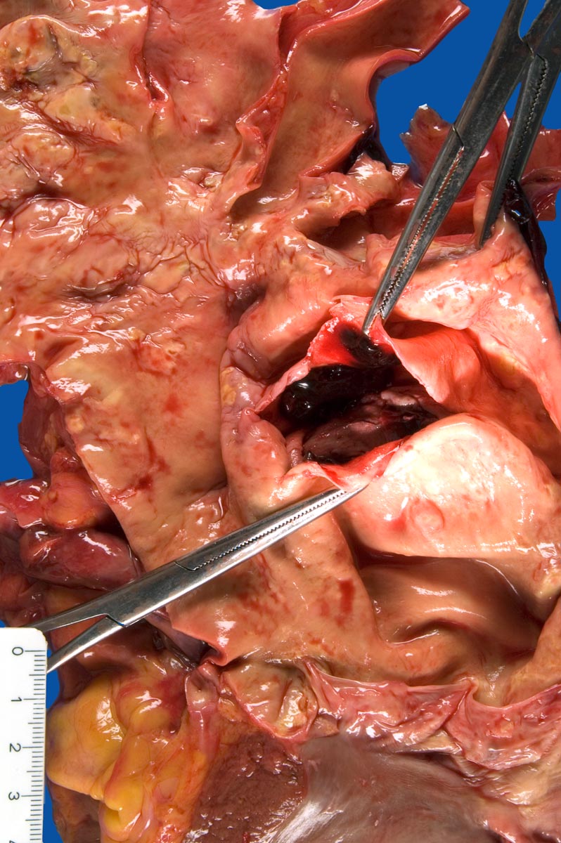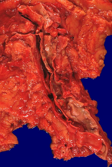 Der Intimaeinriss (auf dem Präparat nicht sichtbar) ist im Bereich einer ulzerierten atheromatösen Plaque erfolgt. update 10. September 2019
