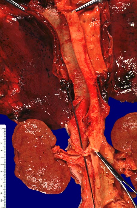 Im Dissektionskanal hat sich ein frischer Abscheidungsthrombus (geschichteter Korallenstockthrombus) gebildet.