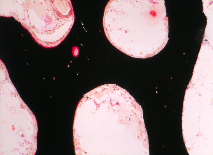 Bei Vitamin D Mangel ist das Gesamtvolumen sowie die Menge des Osteoids auf der Oberfläche der Spongiosabälkchen vermehrt (Volumen- bzw. Oberflächenosteoidose). Wechselt das Angebot an Vitamin D, kann unmineralisiertes Osteoid auch von mineralisierter Matrix eingeschlossen werden (= begrabenes Osteoid ( 3517)). Verbreiterte Osteoidsäume können neben der Osteomalazie (bzw. der Rachitis im Kindesalter) auch bei Hyperparathyreoidismus, bei einer fibrösen Dysplasie oder bei schnell wachsenden knochenbildenden Tumoren beobachtet werden. Insbesondere bei metabolischer Ursache sind die histologischen Veränderungen häufig kombiniert mit Veränderungen einer Fibroosteoklasie, bei der es zu oft tunnelierenden osteoklastären Resorptionen des Knochens und konsekutiver Auffüllung mit einem gut vaskularisierten bindegewebigen Stroma kommt. Die radiologisch nachweisbaren Looser-Umbauzonen (benannt nach dem Schweizer Chirurgen E. Looser) entsprechen Arealen unvollständig durchgebauter Fissuren/Frakturen mit nicht mineralisiertem Faserknochen. Durch eine Tetrazyklinmarkierung in zeitlich definiertem Abstand vor einer Knochenbiopsie kann die Mineralisationsdynamik abgeschätzt werden, da Tetrazykline bei der Mineralisation in den Knochen miteingebaut werden und im Fluoreszenzmikroskop identifiziert werden können.