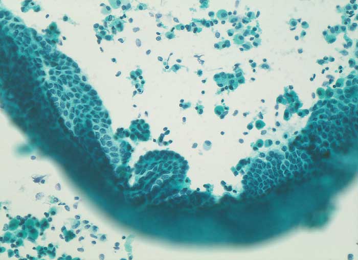 Der Ausstrich ist zellarm. Die Epithelien sind kubisch bis niedrig-zylindrisch und einzeln oder in flach ausgebreiteten Verbänden gelagert. Die Zellgrenzen sind weniger scharf als beim muzinösen Zystadenom. Die Kerne sind rund und das Chromatin ist fein granulär. Nukleolen sind klein oder fehlen. Das Zytoplasma enthält keinen Schleim und ist nicht vakuolisiert. Der apikale Zellrand trägt Zilien, was das seröse Zystadenom von Granulosazellen einer Follikelzyste unterscheidet. Die Zystenflüssigkeit enthält neben Epithelzellen Schaumzellen, Hämosiderin und ältere Blutbestandteile.