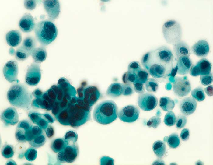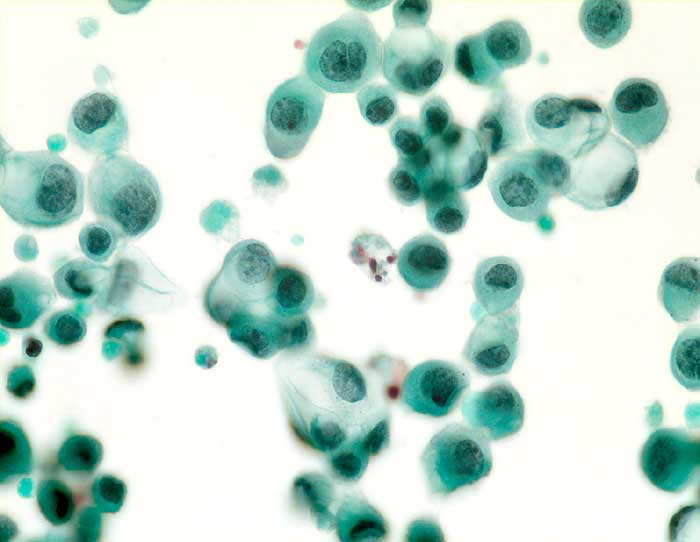 Die Zellen von serösen Zystadenomen, serösen Borderlinetumoren und serösen Karzinomen sehen sehr ähnlich aus. Sie unterscheiden sich lediglich durch eine graduelle Zunahme der Atypien, wobei der Borderlinetumor eine Zwischenstellung einnimmt. Die Epithelien sind kubisch bis niedrig zylindrisch und kommen einzeln oder in kleinen Verbänden vor. Gelegentlich bilden sie knospenförmige Proliferate, die in der Zystenflüssigkeit schwimmen. Die Kerne sind leicht vergrössert und polymorph. Einzelne Zellen können prominente Nukleolen enthalten.