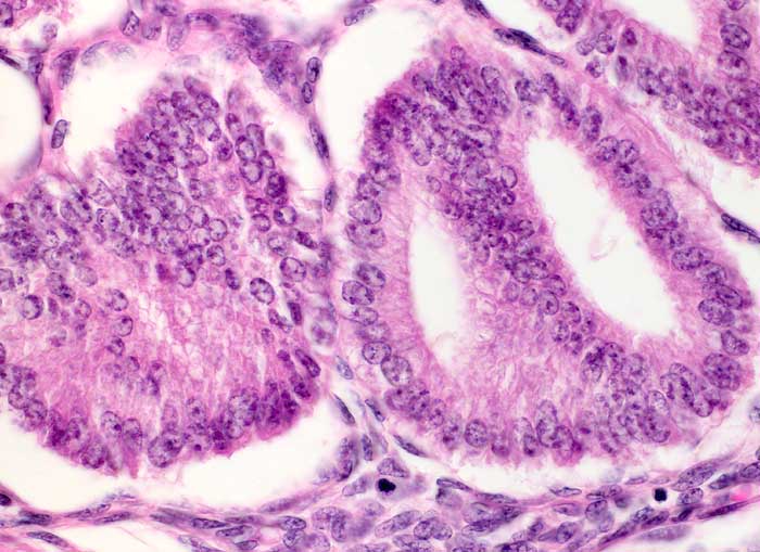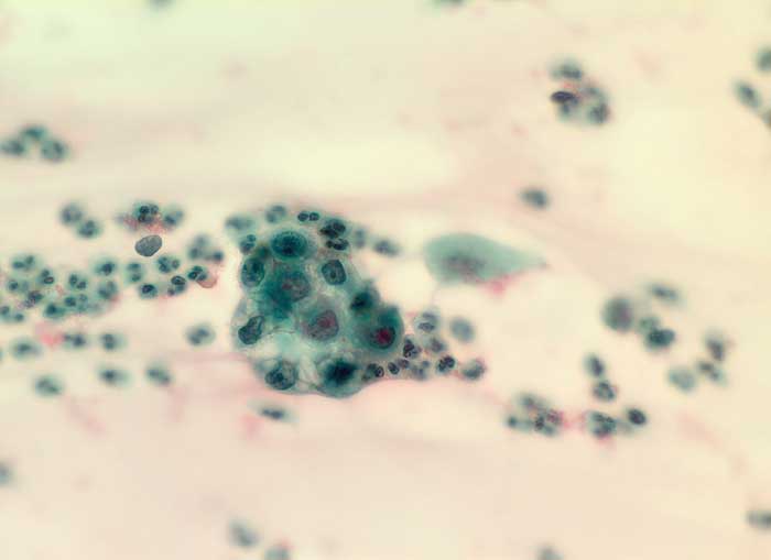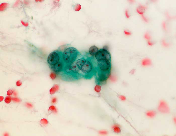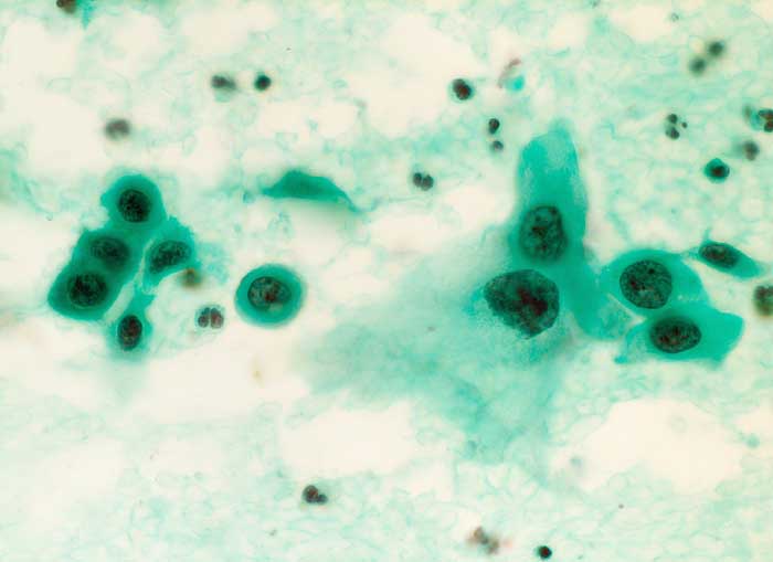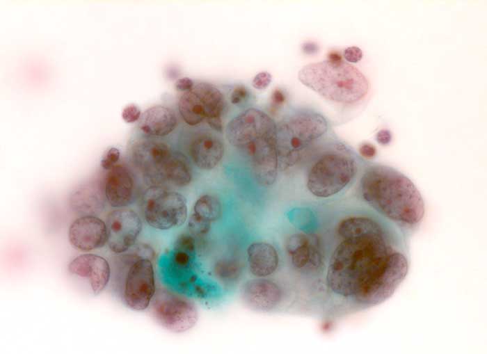 Abstriche aus dem Cavum Uteri und der Portio/Zervix-Abstrich, nicht aber die Spülzytologie zeigen einen typischen Exsudathintergrund mit frischen oder zerfallenden Erythrozyten, Fibrin, Zelldetritus und grossen Histiozyten. Im Portioabstrich erscheinen die Karzinomzellen meist einzeln oder in kleinen Gruppen und sind degenerativ verändert. Beim direkten Endometriumabstrich findet man zusammenhängende Zellhaufen, deren zytologischen Details wegen Überlagerungen oft nicht gut zu erkennen sind. Einzeln liegende Zellen kommen vor allem bei wenig differenzierten Karzinomen vor. Die Kerne sind etwa doppelt so gross wie normale Zylinderzellen. Die Chromatinkörnchen sind nie so grob wie beim Plattenepithelkarzinom. Kleine Nukleolen lassen sich meist nachweisen, Makronukleolen jedoch nur in 5% der Fälle. Anomalien der Kernmembran mit Kerben und Nasenbildung kommen vor allem beim wenig differenzierten Karzinom vor.