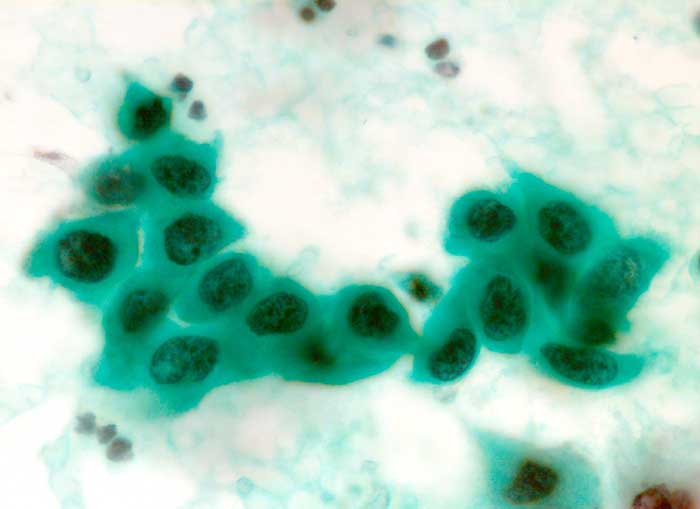 Indirekte Zeichen für ein Karzinom sind der typische Exsudathintergrund, hoher Aufbau des Vaginalepithels und Endometriumzellen im PC-Abstrich nach der Menopause, sowie Endometriumzellen in der zweiten Zyklushälfte vor der Menopause.