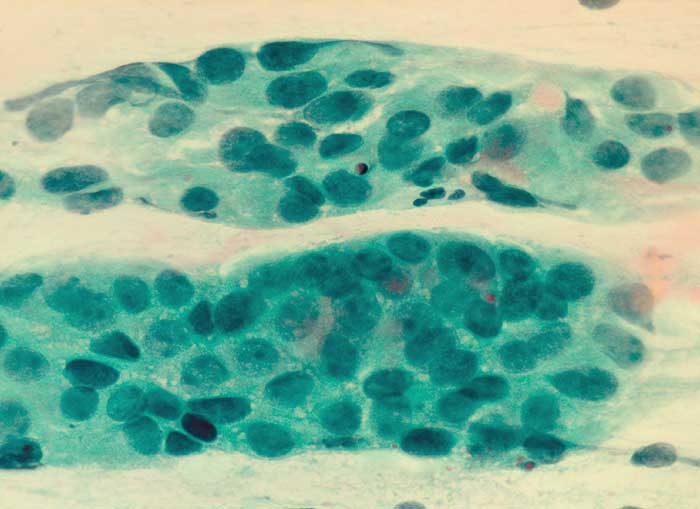 Die Zellkerne der serösen Adenokarzinome sind in den meisten Fällen hochgradig atypisch. Das Zellbild gleicht entsprechend demjenigen eines wenig differenzierten endometrioiden Adenokarzinoms. Da das seröse Karzinom anders als das endometrioide Karzinom nicht Folge eines Hyperöstrogenismus ist, zeigen die meist postmenopausalen Patientinnen keinen hohen Aufbau des Vaginalepithels im PC-Abstrich.