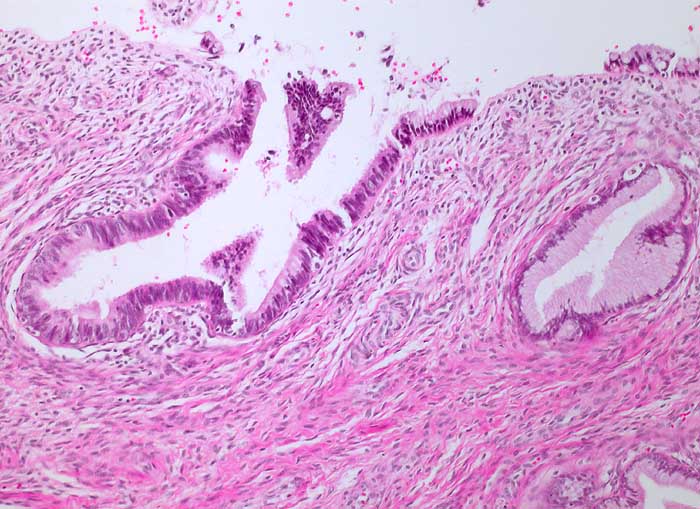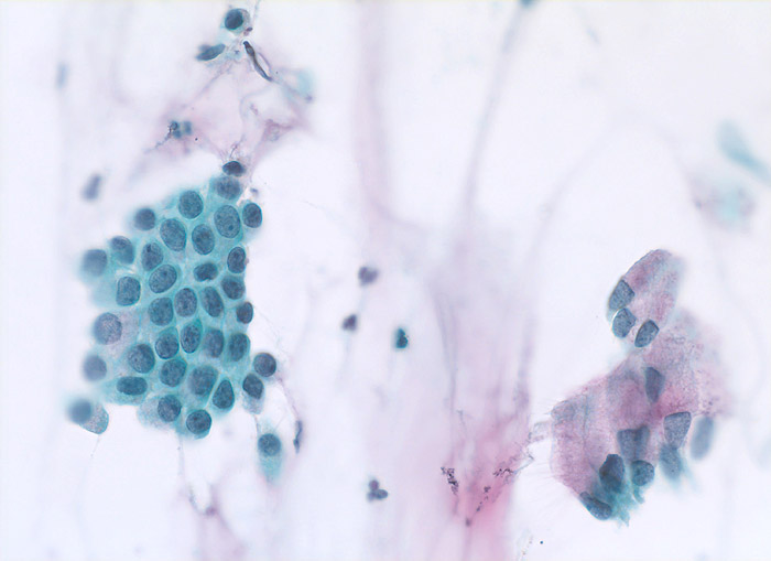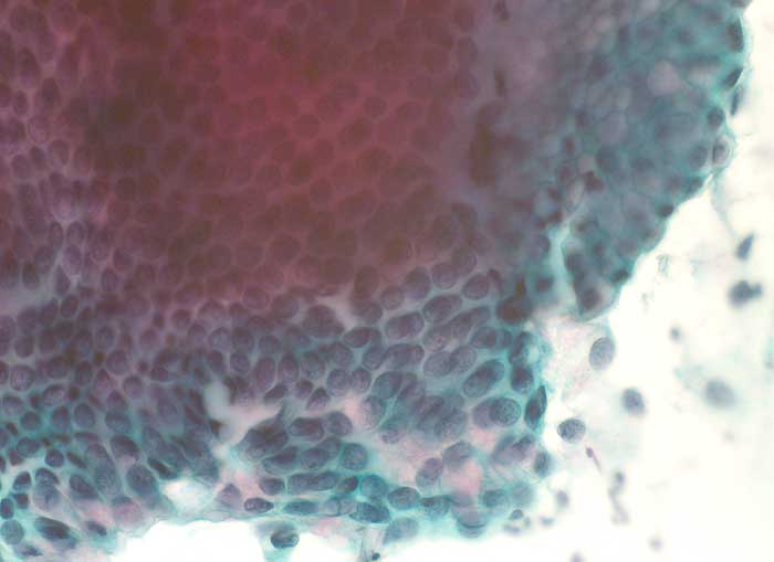 Die Ausstriche des ACIS sind zellreich und enthalten atypische Zylinderzellen mit grossen Kernen. Diese bilden flache Verbände, die in der Aufsicht ein Honigwabenmuster, bei seitlicher Betrachtung ein Palisadenmuster und eine Pseudostratifikation der Kerne erkennen lassen. Die Kerne sind im Vergleich zum normalen Zylinderepithel deutlich grösser und enthalten einen vergrösserten Nukleolus. Eine Hyperchromasie ist nicht immer vorhanden und das granuläre Chromatin ist regelmässig verteilt. Der zytologische Nachweis von atypischen Zylinderepithelien sollte histologisch weiter abgeklärt werden.