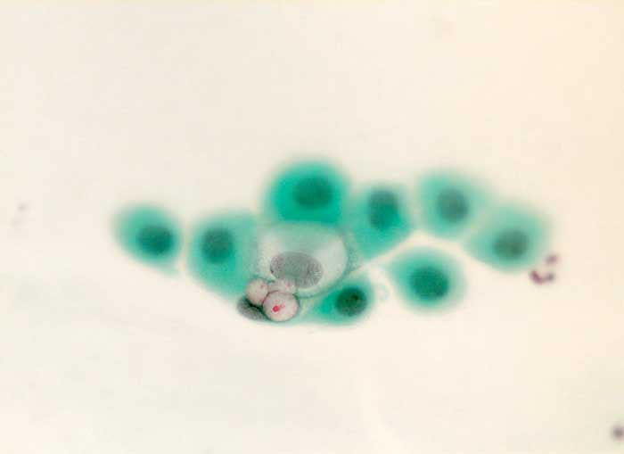 Von Chlamydien befallene Epithelien enthalten scharf begrenzte, transparente, paranukleäre Vakuolen mit mehreren kleinen, rötlichen Einschlusskörperchen. Diese Vakuolen sieht man meist in Metaplasiezellen und Zylinderzellen, seltener in Plattenepithelien. Da sie unspezifisch sind, ist lediglich eine Verdachtsdiagnose möglich. Eine weitere Abklärung ist bei Vulvitis und Kolpitis während der Schwangerschaft angezeigt. Der Erregernachweis am Ausstrich kann mittels ELISA, DNS-in-situ-Hybridisierung oder immunzytochemisch erfolgen.