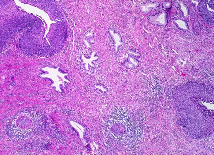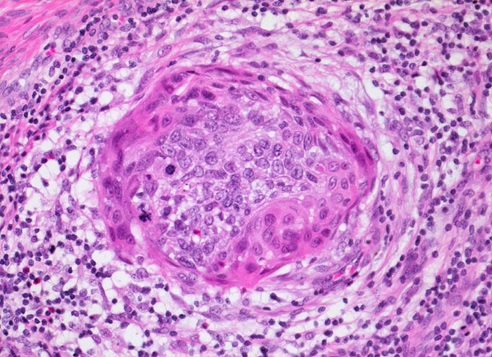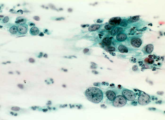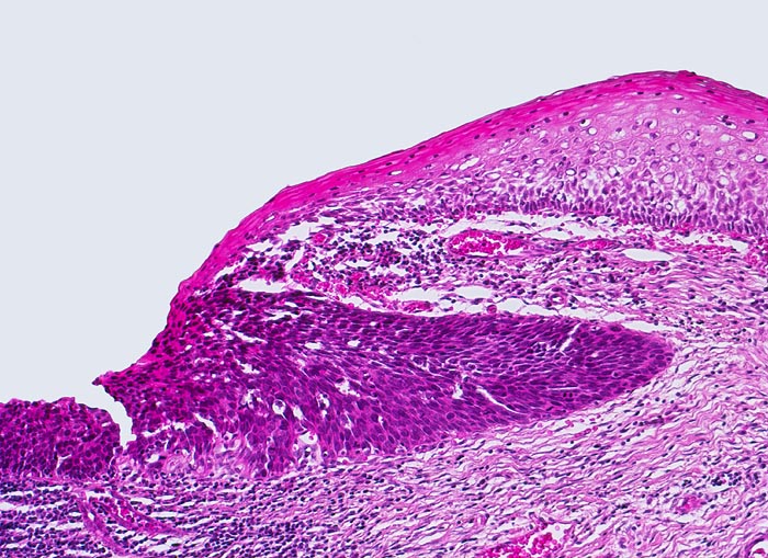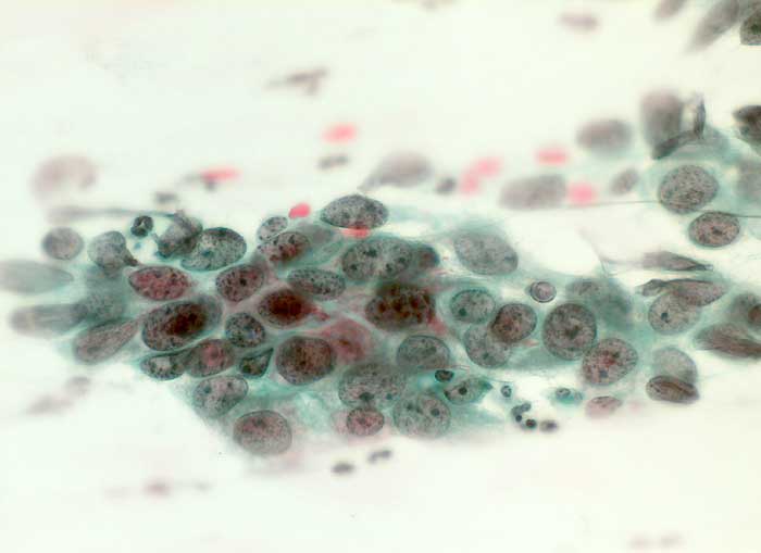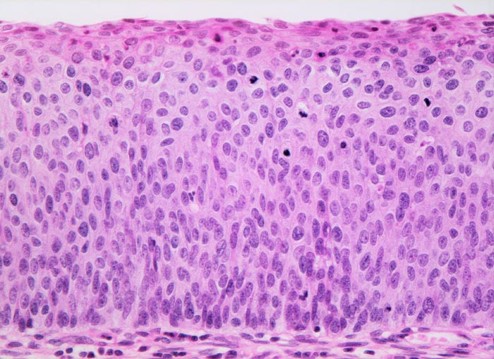 Das Carcinoma in situ wird in der Bethesda Klassifikation zusammen mit der mittelschweren und der schweren Dysplasie eingeteilt als high grade squamous intraepithelial lesion (HSIL). Im Vergleich zur schweren Dysplasie nehmen Grösse und Hyperchromasie der Kerne weiter zu. Die Zellgrösse entspricht dem Basalzelltyp. Das Chromatin ist grob verklumpt und unregelmässig verteilt. Der Kernhintergrund ist hell. Dadurch entsteht die an ein Leopardenfell erinnernde Kernstruktur. Grosse Nukleolen sind verdächtig auf eine bereits vorhandene Mikroinvasion (zweites Bildbeispiel). Zytologische und histologische Aufnahmen stammen von verschiedenen Patientinnen.