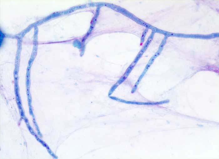 Aspergillen gehören in die Gruppe der Schimmelpilze und wachsen ubiquitär auf organischen Stoffen. Der Erreger ist charakterisiert durch echte septierte Hyphen von 3 bis 6 Mikrometer Durchmesser. Die Hyphen verzweigen sich in einem Winkel von 45 Grad. Selten sind auch die ( 10851)( 10849) Fruchtköpfe (Conidiophoren) nachweisbar. Aspergillusinfekte manifestieren sich je nach Resistenzlage als Aspergillom, invasive Aspergillose oder allergische Aspergillose. Der Nachweis von Aspergillus beweist noch nicht eine klinisch relevante Infektion.