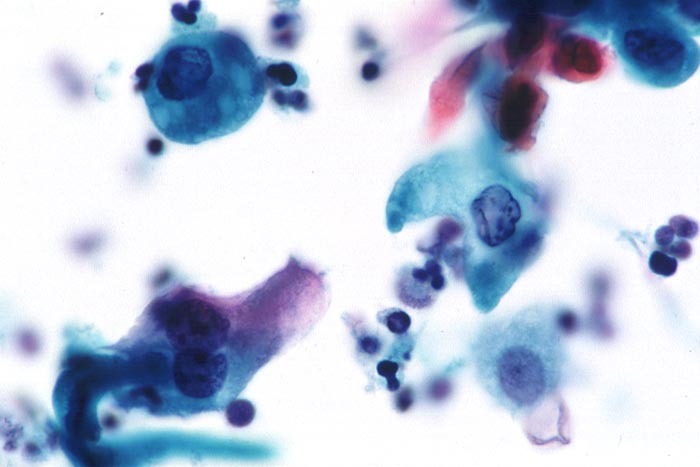 Der zytologische Befund entspricht dem der Plattenepithelkarzinome an anderen Orten. Allerdings finden sich oft auffallend wenig Tumorzellen, die überdies oft nur geringe Atypien aufweisen.