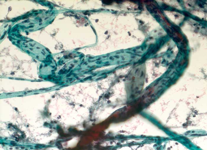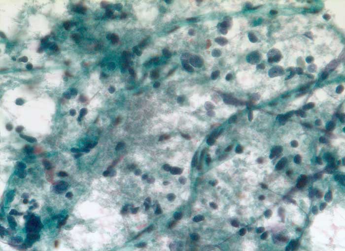 Die Waschflüssigkeit ist eher zellarm. Die Ausstriche erscheinen sauber. Den Hintergrund bildet eine feinfasrige Matrix vermischt mit Nervenzellen, normalen und reaktiven Gliazellen. Die astrozytären Tumorzellen sitzen typischerweise Kapillarachsen auf. Endothelhyperplasie und Kapillarproliferate sind im Ausstrich gut zu sehen. Das Zytoplasma ist unscharf und bildet feine fasrige Fortsätze. Die Tumorzellkerne sind rund bis oval oder angedeutet spindelig, das Chromatin feingranulär. Zellgrösse, Polymorphie und Kernatypie nehmen mit abnehmender Differenzierung zu.