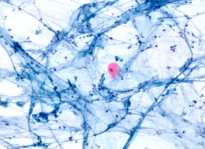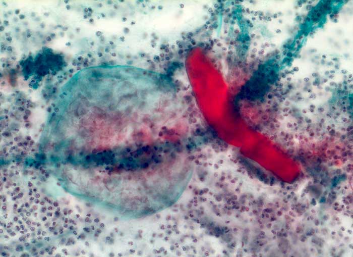 Eine offene Verbindung zwischen Bronchialsystem oder Ösophagus und Pleuraraum kann entstehen als Folge von nekrotisch zerfallenden Tumoren, einschmelzenden Lungeninfarkten, Lungenabszessen oder tuberkulösen Kavernen. Zytologisch entspricht der Befund einem Empyem. Zusätzlich enthalten die Ausstriche Plattenepithelien der Mundhöhle bzw. des Ösophagus oder Flimmerzellen. Das erste Bild zeigt eine bronchopleurale Fistel. Die folgenden Bilder Speisepartikel im Pleuraraum bei ösophagopleuraler Fistel.
