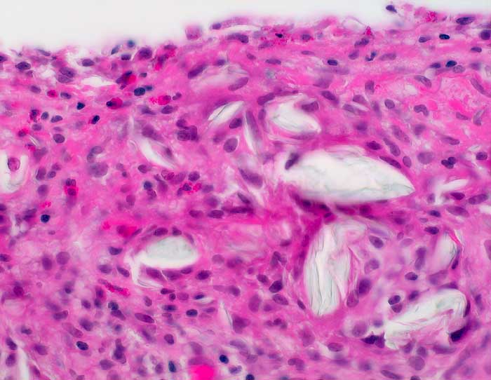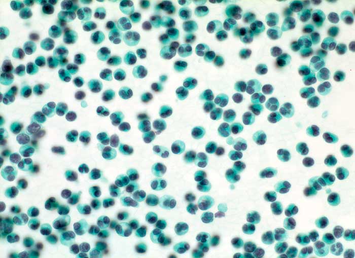 Rund 4-5% aller Pleuraergüsse sind eosinophile Ergüsse mit einem Eosinophilenanteil von mehr als 10% der Zellen. Meist sind auch Lymphozyten und Mastzellen vermehrt. Manchmal findet man zahlreiche Charcot-Leyden'sche Kristalle. Das ätiologische Spektrum ist breit. Eosinophile Ergüsse lassen sich beobachten bei Spontanpneumothorax, Blutung, subakuter Entzündung, Parasiten oder idiopathisch.