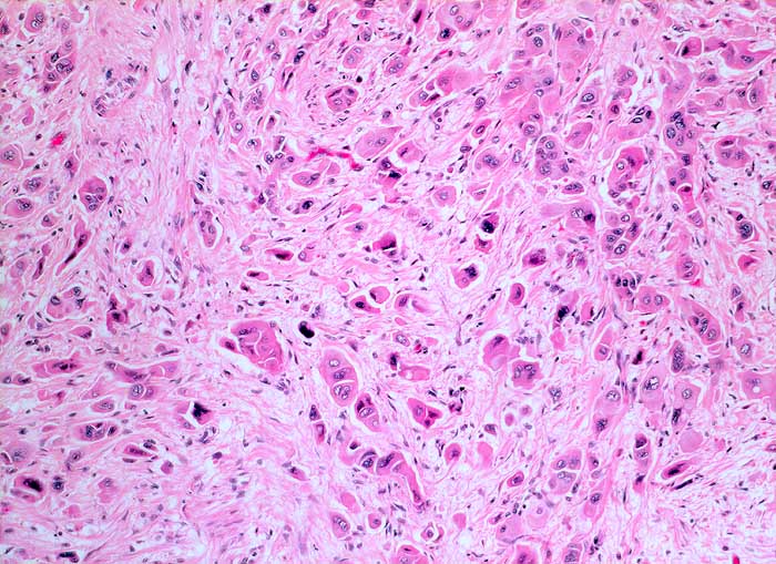 Pankreaskarzinome bilden in Ergüssen kleine Verbände oder liegen einzeln und sind dann schwer von Mesothelien oder Makrophagen unterscheidbar. Ähnlich wie beim Ovarialkarzinom besteht ein gewisser Dimorphismus mit einzelliegenden grossen Zellen mit grob vakuolisiertem Zytoplasma neben kleinen Zellen. Die Tumorzellkerne sind deutlich polymorph bei geringer Grössenschwankung, die atypischen Nukleolen sind gut sichtbar.