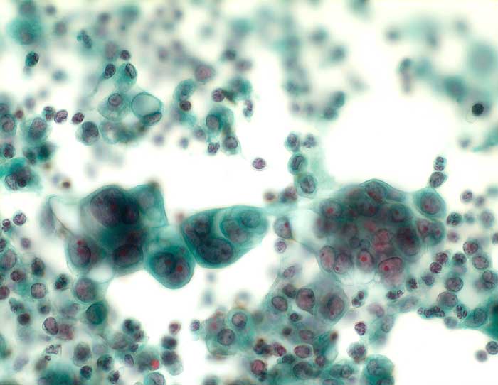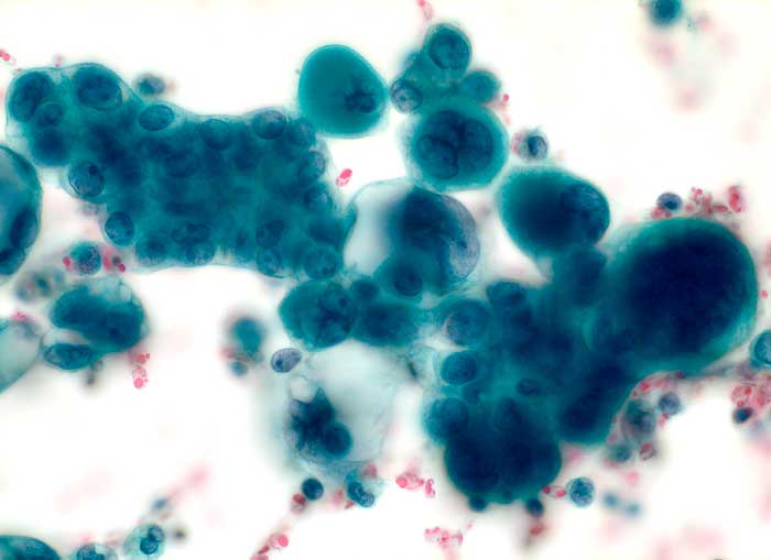 Beim serösen Zystadenokarzinom des Ovars findet man oft scheinbar zwei Tumorzellpopulationen (Dimorphismus). Das heisst, die Karzinome sind heterogen aufgebaut und weisen nebeneinander einige grosse vakuolisierte Zellen und kleinere kubische Zellen im gleichen Zellverband auf. Sehr typisch, aber nicht beweisend für einen serös papillären Tumor ist der Nachweis von Psammomkörperchen.