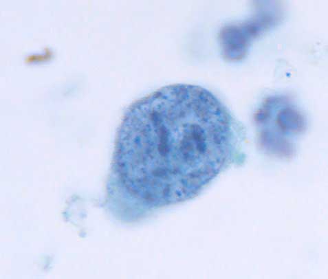 Das Urinsediment ist wie bei den meisten papillären Tumoren zellreich. Die Atypien sind auf den ersten Blick zu sehen. Die Tumorzellen sind deutlich grösser als Basal- und Parabasalzellen. Die Kerne sind polymorph, hyperchromatisch und sehr grob strukturiert. Sie können den lavabrockenähnlichen Kernen des Plattenepithelkarzinoms gleichen. Die Kernmembran ist oft gebuchtet oder grob gebuckelt. Büschel von hochgradig atypischen zylindrischen Urothelien weisen auf die papilläre Struktur des Tumors hin. Blut und Detritus bilden den Ausstrichhintergrund.