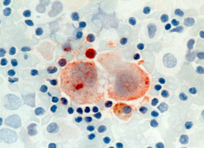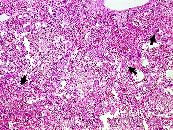 Das Zytomegalievirus befällt Makrophagen und Endothelzellen von immunsupprimierten Patienten. Die virusbefallenen Zellen sind deutlich vergrössert und enthalten einen grossen intranukleären Einschlusskörper, der sich durch einen schmalen hellen Zytoplasmasaum von der Kernmembran abhebt (Eulenaugenzellen). Die bis zu 1 Mikrometer grossen zytoplasmatischen Einschlusskörper konzentrieren sich meist im paranukleären Zytoplasma. Der Ausstrichhintergrund in der BAL ist oft sauber, da aufgrund der Immunsuppression eine entzündliche Reaktion fehlt.