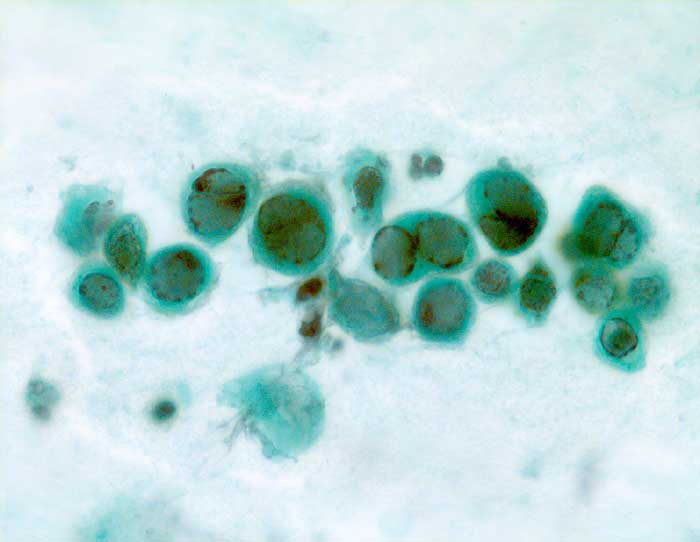 Herpes simplex Viren befallen Plattenepithelien. Sie führen zu typischen milchglasartigen zytoplasmatischen und nukleären Einschlusskörpern in den teils mehrkernigen Plattenepithelzellen. Das Kernchromatin ist in kleinen Klumpen entlang der Kernmembran angeordnet.