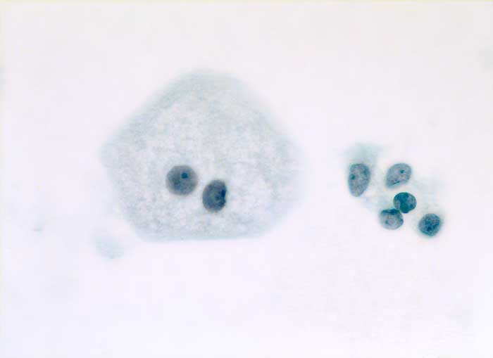 Die Typen BK und JC des Polyomavirus sind für den Menschen pathogen. Das JC Virus verursacht die progressive multifokale Leukenzephalopathie. Das BK Virus persistiert in der Niere, ohne eine manifeste Erkrankung hervorzurufen. Bei Immunsupprimierten kann es zu einer klinisch manifesten Infektion der Nieren kommen. Nukleäre Viruseinschlusskörper finden sich in solchen Fällen im Epithel der Sammelrohre und im Epithel anderer Tubulusabschnitte und im Urothel von Nierenbecken und Ureter. Gehäuft tritt der Niereninfekt unter Immunsuppression mit Tacrolimus auf. Die Urinzytologie stellt die einfachste Nachweismethode dar. Die Polyomavirus-infizierten Decoy-Zellen (=Lockvogelzellen wegen Verwechslungsmöglichkeit mit atypischen Zellen) enthalten einen milchglasartigen Kern. Das Chromatin ist grobschollig und and die Kernmembran gedrängt. Bei drohender Transplantatabstossung ist zusätzlich die Zahl der tubulären Zellen im Urin deutlich erhöht.