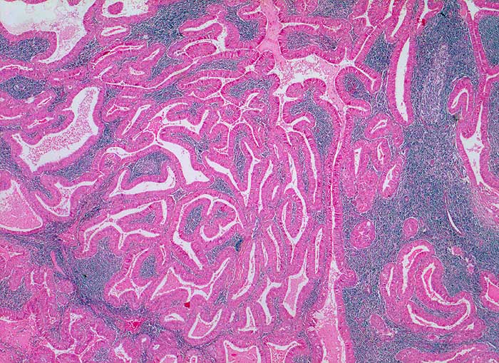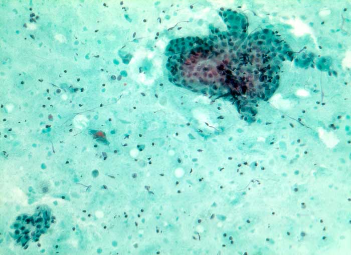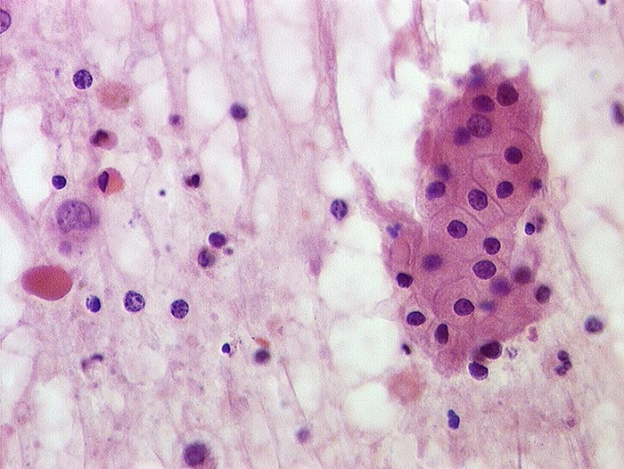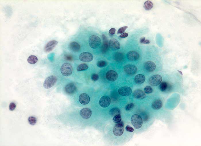 Der Warthin Tumor ist ein zystisch papillärer Tumor mit lymphoidem Stroma und einem zweischichtigen onkozytären Epithel. Schleim- oder Becherzellen und metaplastisches Plattenepithel können vorkommen. Die diagnostischen Zellen werden oftmals verdünnt durch den Zysteninhalt, was in einer falsch negativen Punktion resultieren kann. Im Idealfall enthält das Punktat Onkozyten und Lymphozyten auf granulär zystischem Hintergrund. Oftmals fehlen aber die Onkozyten. Differentialdiagnostisch muss man in solchen Fällen an eine lymphoepitheliale (oder branchiogene) Zyste denken. Onkozyten kommen bei einer Vielzahl anderer Parotisläsionen vor: onkozytäre Metaplasie oder Hyperplasie, Sjögren Syndrom, Onkozytom, Mucoepidermoidkarzinom, Adenokarzinom, adenoidzystisches Karzinom.