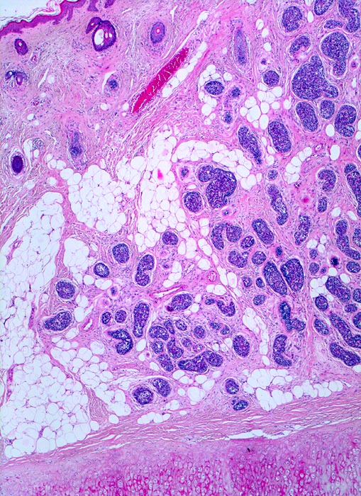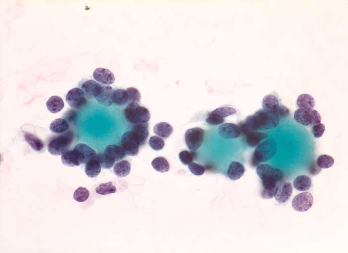 Das zytologische Bild ist täuschend bland. Die Tumorzellen sind klein und monomorph, die Kern-Zytoplasmarelation ist hoch. Die Kerne sind dunkel, rund bis oval oder angulär und enthalten bisweilen einen kleinen Nukleolus. Typisch sind azelluläre Matrixkerne, um die die Tumorzellen angeordnet sind.