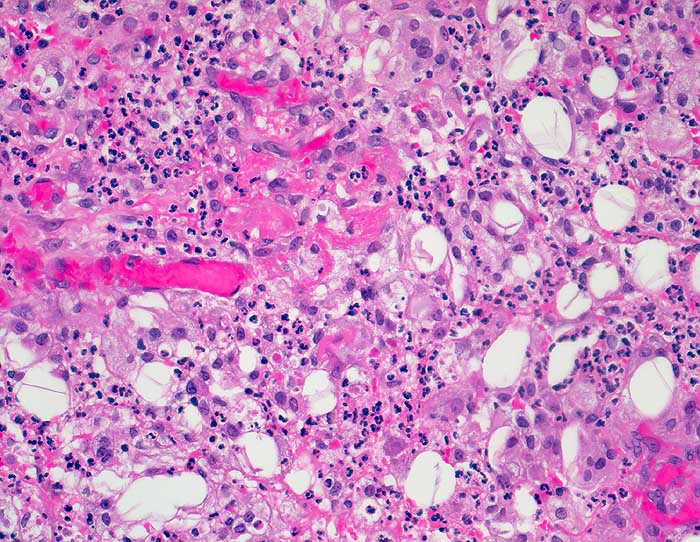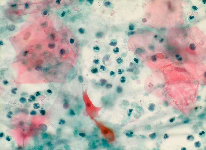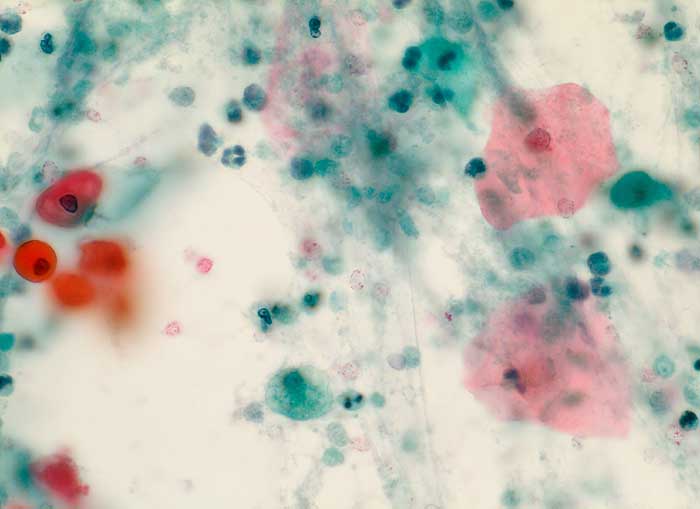 Epidermal ausgekleidete Zysten (Atherome) werden oft punktiert. Pathognomonisch sind dichte Zusammenballungen von kernlosen gelb gefärbten Hornschuppen. Nach einer Zystenruptur ist der Hintergrund detritisch und enthält wie bei einem Abszess zahlreiche neutrophile Granulozyten und Schaumzellen. Die Hornschuppen werden oft von Fremdkörperriesenzellen und Histiozyten umlagert. Nekrotische Lymphknotenmetastasen von hochdifferenzierten Plattenepithelkarzinomen können ähnlich aussehen. Die Plattenepithelzellen des Karzinoms sind aber oft bizarr geformt und weisen atypische Kerne auf.