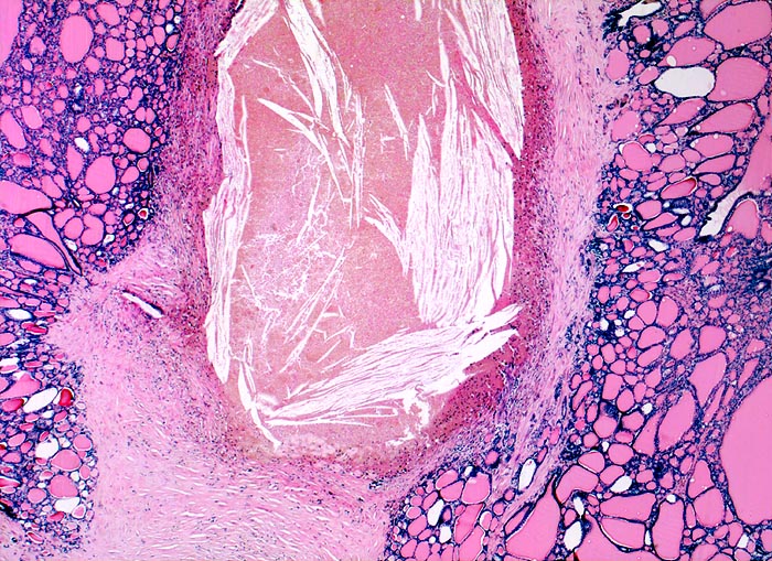 Grosse Kolloidmengen, ein regelmässiges honigwabenartiges Muster flächenhafter Zellverbände und grosse Follikel sind die mikroskopischen Merkmale eines gutartigen Strumaknotens.