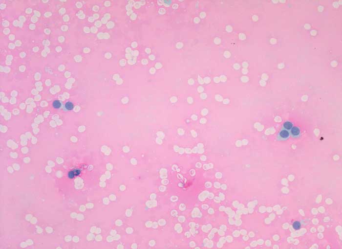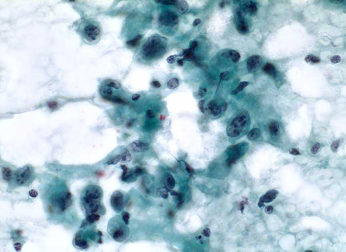 Abstriche von anaplastischen Karzinomen sind gewöhnlich sehr zellreich ausser bei ausgeprägter Desmoplasie. Die Grösse und die Form der Tumorzellen ist äusserst variabel. Oft finden sich sehr grosse, bizarre und spindelförmige Zellen. Die Kerne weisen offensichtliche Zeichen der Malignität auf: irreguläre Kernmembran, grobes dunkles Chromatin und Makronukleolen. Mitosen, auch atypische, sind häufig. Das Zytoplasma variiert von blass und vakuolisiert über granulär bis dicht. Nekrosen, neutrophile Granulozyten und eine Tumordiathese im Hintergrund sind typisch. Die Tumoren exprimieren Vimentin und Zytokeratine, sind aber negativ für Thyreoglobulin und TTF1 (Thyroid Transcription Factor).