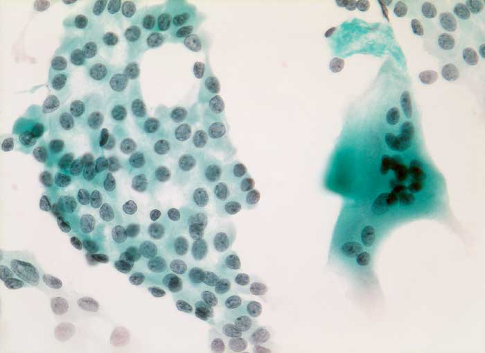 Die zytologischen Ausstriche sind meist zellreich und enthalten grosse einschichtige Zelltapeten in regelmässiger honigwabenartiger Anordnung. Dreidimensionale verzweigte Papillen mit fibrovaskulären Stromastielen finden sich lediglich in 10-60% der Fälle. Follikuläre Strukturen sind in bis zu 85% der Fälle zu sehen. Der Hintergrund ist oft zystisch mit Schaumzellen und mehrkernigen Riesenzellen. Gelegentlich lassen sich Psammomkörperchen nachweisen. Sehr wichtig für die Diagnose sind folgende Kernkriterien: leicht vergrösserte uniforme Kerne, unregelmässige Kernmembran, Kernkerben (grooves), intranukleäre Zytoplasmainvaginationen und prominenter eosinophiler Nukleolus.