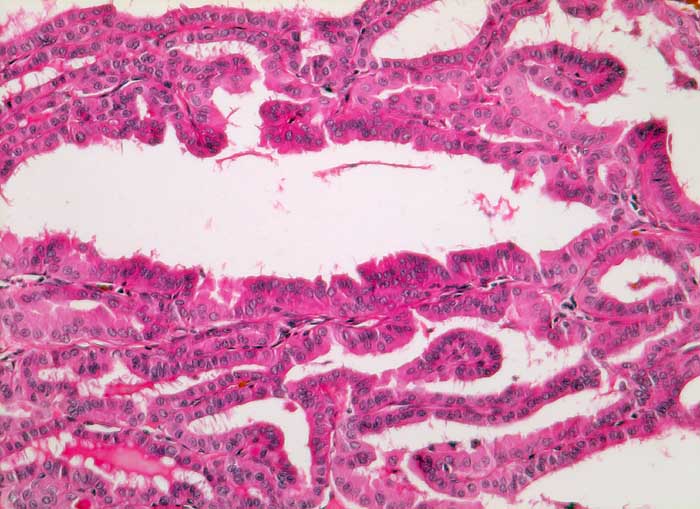 Klassisches diagnostisches Merkmal papillärer Schilddrüsenkarzinome sind fingerartige Papillen mit einem fibrovaskulären Stiel. Echte Papillen sind hochcharakteristisch aber gleichwohl nicht pathognomonisch für das papilläre Karzinom. Man findet sie auch bei Schilddrüsenhyperplasie, bei Thyreoiditis und in medullären Schilddrüsenkarzinomen. Ein Teil der papillären Schilddrüsenkarzinome zeigt überdies ein überwiegend follikuläres Wachstumsmuster. Die Diagnose des papillären Karzinoms wird dann aufgrund der typischen Kernmorphologie gestellt.