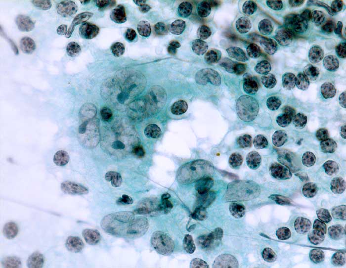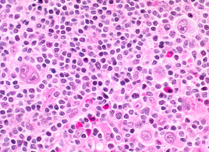 Die Tumorzellen sind einkernig (Hodgkin Zelle) oder mehrkernig (Reed-Sternbergzellen) und enthalten einen sehr grossen Nukleolus. Die Tumorzellen sind immunzytochemisch positiv für CD15 und CD30. Nodulär sklerosierender und gemischtzelliger Subtyp des Hodgkin Lymphoms sind zytologisch nicht sicher zu unterscheiden.