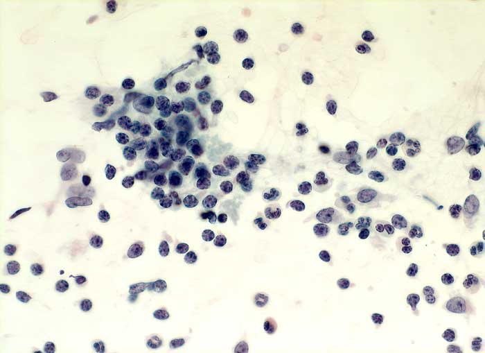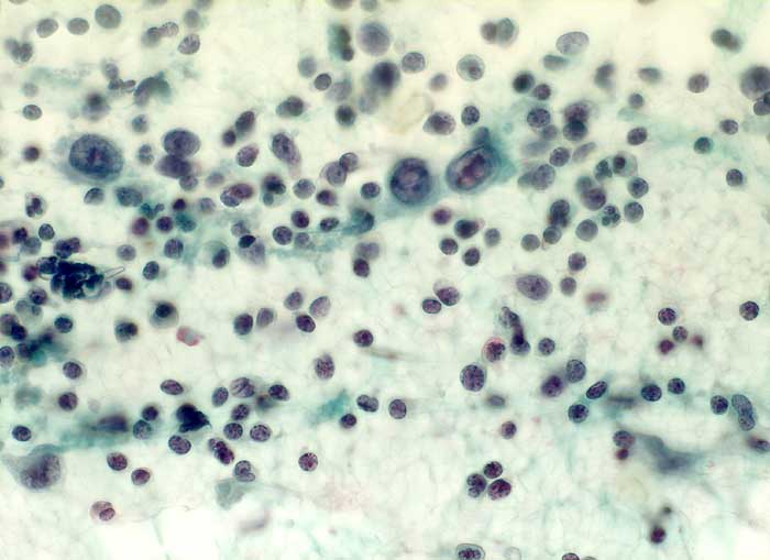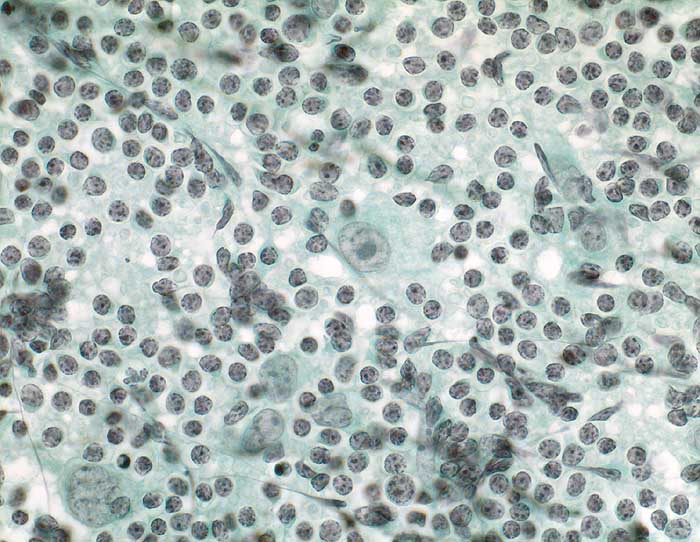 Das Zellbild ist bunt und umfasst Lymphozyten, Plasmazellen, eosinophile Granulozyten und einzeln im reaktiven Infiltrat liegende Tumorzellen.