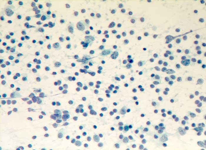 In vielen Fällen entspricht das zytologische Bild bei Mononukleose einer gewöhnlichen reaktiven follikulären Hyperplasie. Seltener findet sich das typische bunte Bild mit vielen plasmozytoiden Zellen und grossen, manchmal doppelkernigen Blasten vom Typ der Zentro-, Immuno- oder Plasmoblasten. Auch Plasmazellen und Granulozyten kommen vor. Stark aktivierte lymphoide Zellen können zur Verwechslung mit einem malignen Lymphom führen.