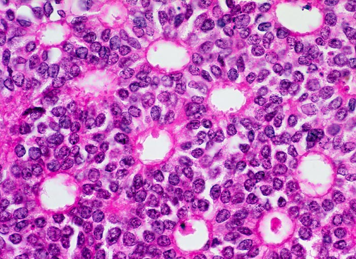 Das DCIS zeigt im Gegensatz zur atypischen Hyperplasie eher diskohäsive Verbände und Einzelzellen. Bei der atypischen Hyperplasie sind gutartige Zellelemente beigemischt und die Verbände können irreguläre oder schlitzartige Lumina enthalten.