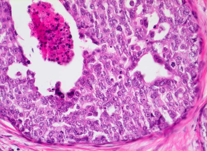 Das duktale Carcinoma in situ (DCIS) wird unterteilt in DCIS mit oder ohne Komedonekrosen. Das DCIS mit Komedonekrosen ist charakterisiert durch offensichtlich maligne Zellen auf nekrotischem Hintergrund. Zytologisch hochdifferenzierte DCIS ohne Komedonekrosen sind monomorpher.
