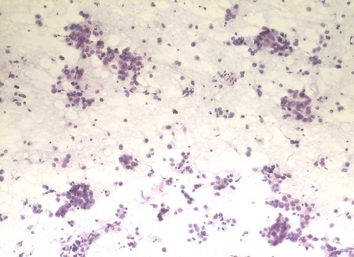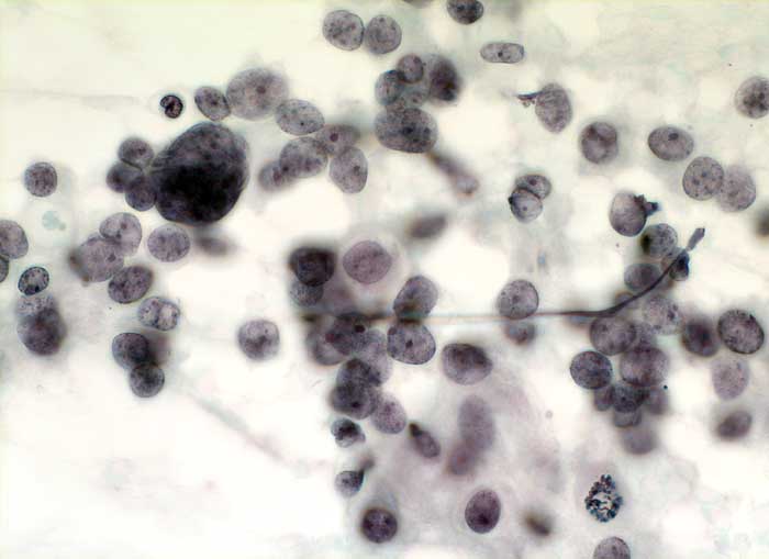 Das invasive Mammakarzinom zeigt zytologisch eine homogene Population maligner Zellen. Typischerweise sollten die Ausstriche zellreich sein und alle vorhandenen Zellen sollten maligne aussehen. Wenn man atypische Zellen suchen muss, ist der Ausstrich nicht diagnostisch für ein Karzinom, kann aber gleichwohl verdächtig sein. Die malignen Zellen sind in lockeren Gruppen gelagert und viele liegen einzeln. Crowding, Zellkannibalismus und Kernmolding sind gute Hinweise auf Malignität. Myoepithelien sind meistens aber nicht immer abwesend. Mammakarzinomzellen sind eher monomorph und deutlich grösser als normale duktale Epithelien. Zellkerne, die grösser sind als zwei Erythrozytendurchmesser, sind tumorverdächtig. Fast immer sind Kerbungen der Zellmembran nachweisbar. Das Chromatin ist im Gegensatz zu anderen Adenokarzinomen fein granulär und gleichmässig im Kern verteilt. Nukleolen sind meist unscheinbar. Makronukleolen sprechen für ein invasives Karzinom.